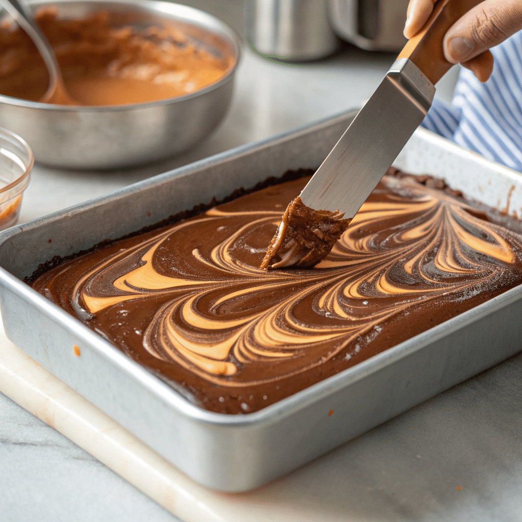 Drop spoonfuls of caramel across the top, then swirl gently with a knife or toothpick. Avoid overmixing for distinct marbled ribbons.