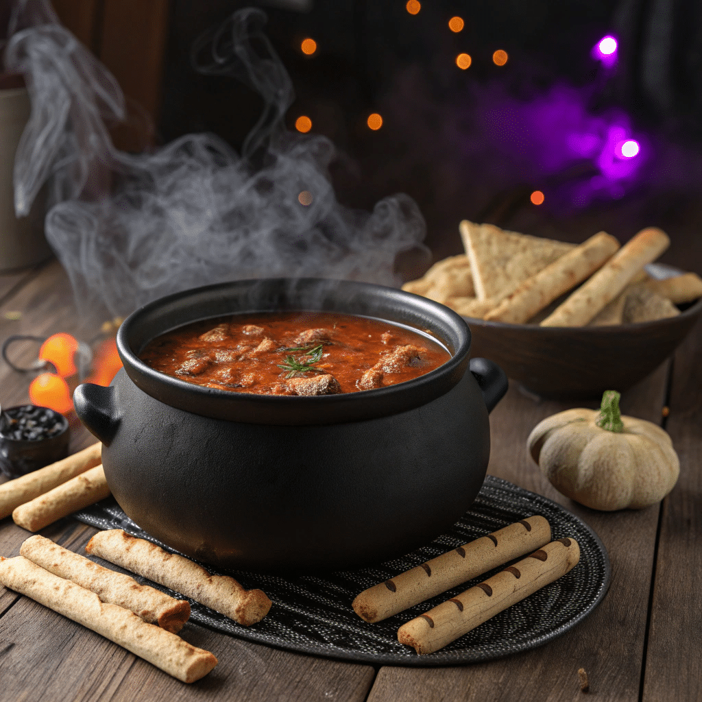 This Cauldron Stew with Bread “Bones” brings cozy comfort food with a spooky Halloween twist. A rich, savory stew loaded with tender beef, vegetables, and herbs is ladled into mini black cauldrons for serving. To complete the eerie effect, bone-shaped breadsticks are baked until golden and served alongside for dipping. It’s warm, filling, and fun to serve at Halloween parties or themed dinners. The playful bread “bones” make it festive, while the flavorful stew keeps everyone satisfied.