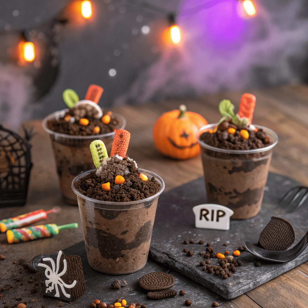 These Graveyard Chocolate Mousse Cups are a frightfully fun Halloween dessert. Layers of silky chocolate mousse are topped with crushed chocolate cookies to resemble dirt, then decorated with cookie “tombstones” and candy pumpkins. A little whipped cream or icing can be piped onto the tombstones to spell “RIP” for an extra spooky touch. They’re indulgent, festive, and surprisingly easy to make, making them a perfect choice for Halloween parties or a fun family dessert night.