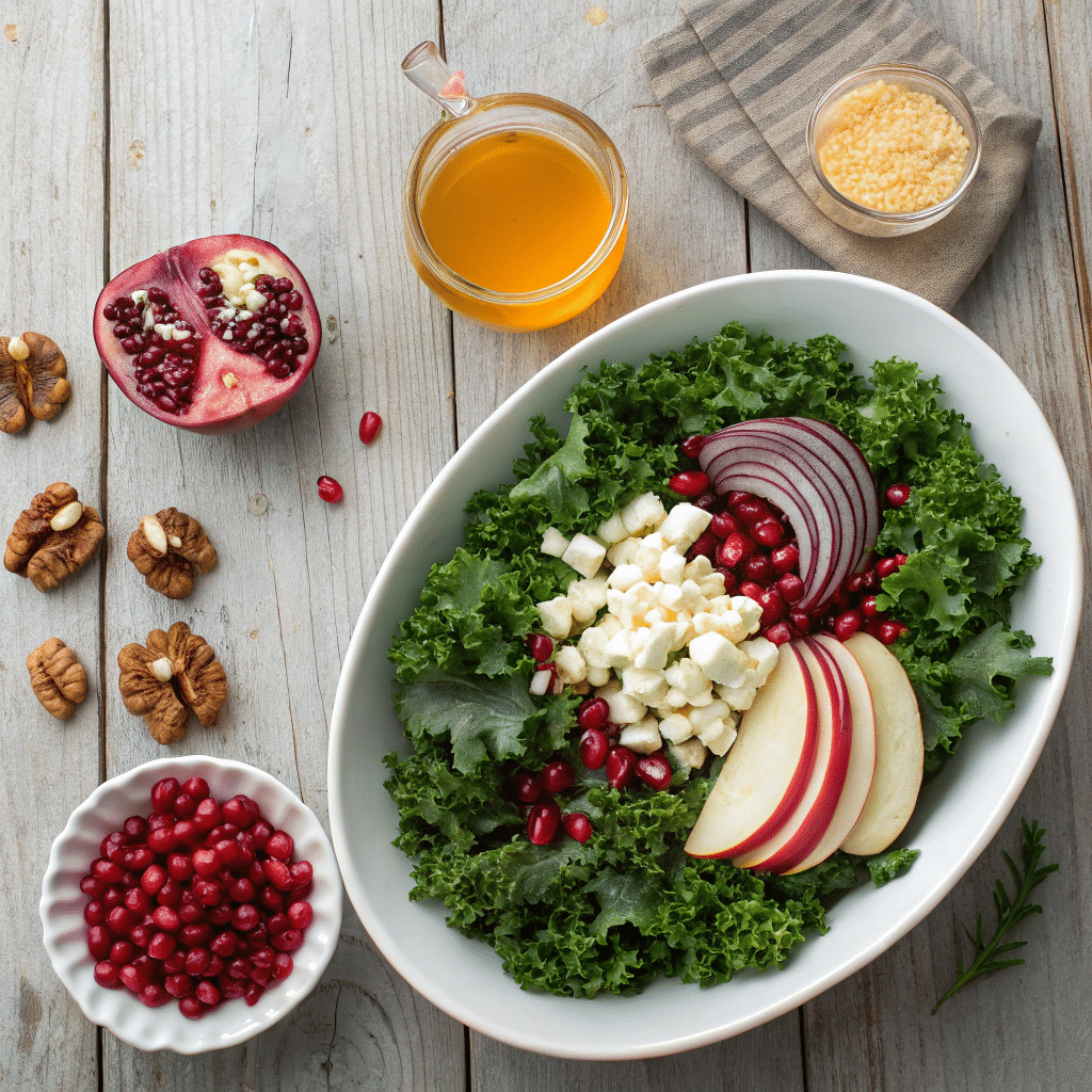3. Add pomegranate seeds, apple slices, red onion, and nuts to the kale.