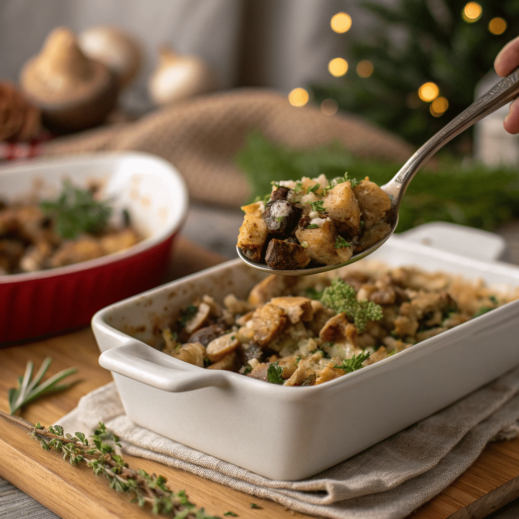 Use a mix of wild mushrooms for depth of flavor. Toast bread cubes to prevent soggy stuffing. Don’t oversaturate with broth—aim for moist but firm. Bake uncovered for a crisp, golden crust.